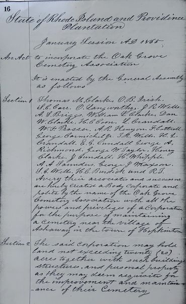 Incorporated in 1865, historical Oak Grove Cemetery, located in the village of Ashaway, Rhode Island, is an irreplaceable part of our community. Oak Grove Cemetery is the final resting place of those who created Ashaway Village history and many of our founding families; some of whom include the Crandalls, Wells, Briggs, Hill and Cottrell families. Our grounds are also the final resting place of over 200 veterans from all branches of the military beginning with the Revolutionary War. Oak Grove is a tranquil place of natural beauty adorned with lovely old trees, seasonal flowers, and historic statuaries, along with 20 acres of lawn.